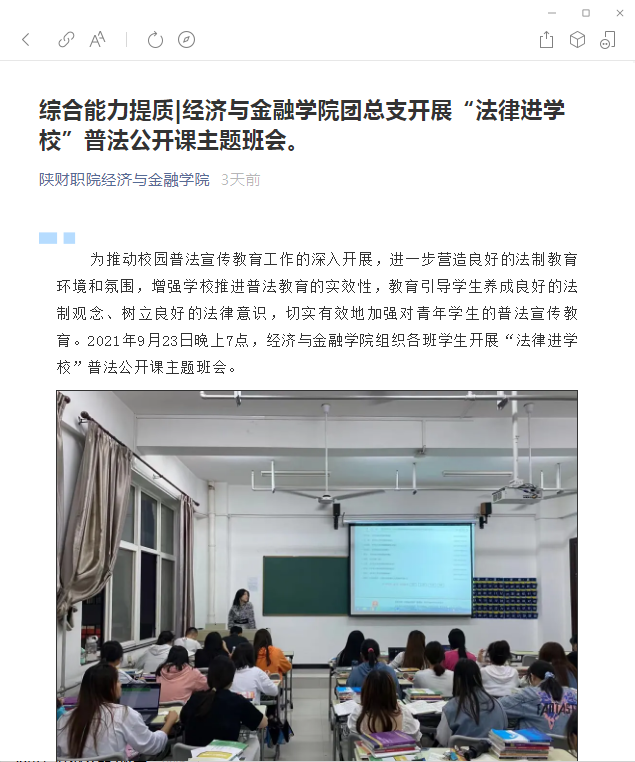 3、撰写心得:为提升学习成效,各班级鼓励学生提交“法律进课堂”学习心得,大家分别从培养法治思维,建成法治国家等方面进行阐述各自的学习收获。