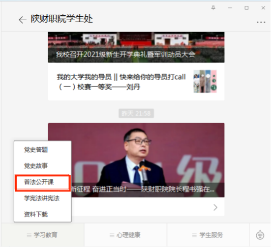 为进一步加强学生法治宣传教育,提升学生法律意识,全力做好学生的“开学第一课”,根据陕西省教育厅《转发中共省委普法工作领导小组办公室关于组织收看“法律进学校”普法公开课的通知》的文件要求,结合我院实际,从2021年9月16日至9月25日,我院利用多种形式,认真组织开展了“法律进学校”法治第一课活动。