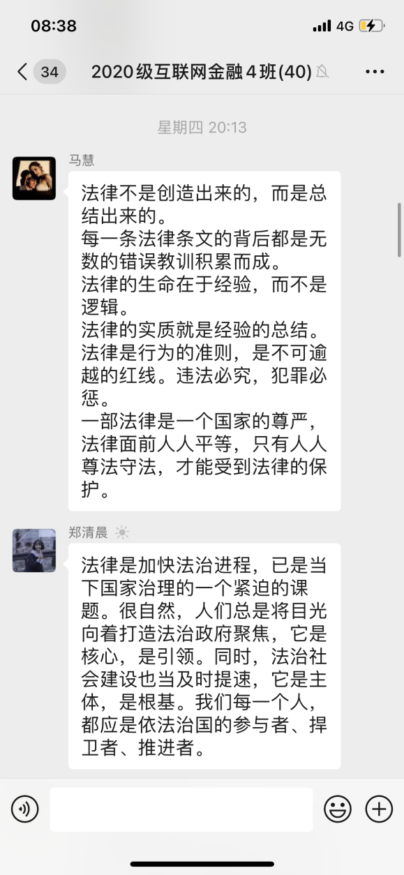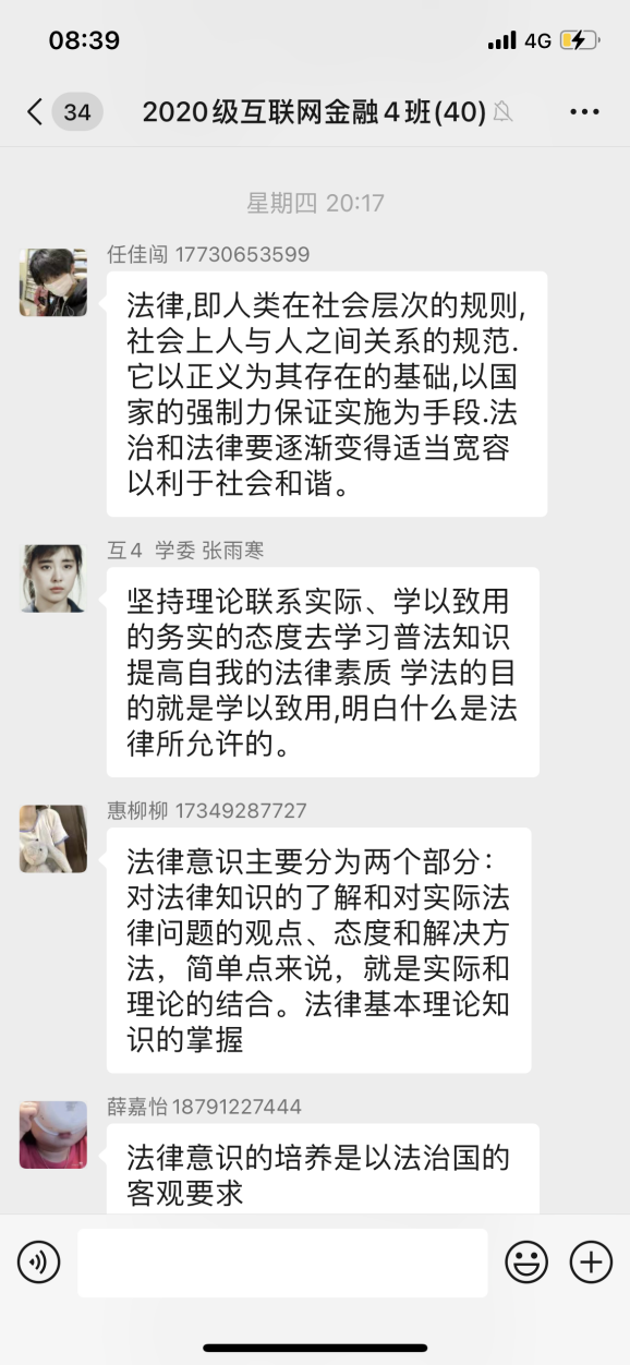 2022届毕业生,因顶岗实习已经到校外实习单位工作,这些非在校学生拓展网络渠道开展学习交流。同学们利用工作之余的碎片化时间自行收看学习普法公开课,各班辅导员利用网络工具组织开展了线上交流讨论,保证了学习的成效。