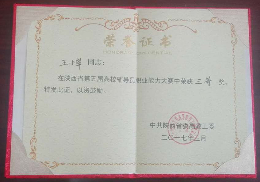 2017年3月下旬,省高教工委举办了全省第五届高校辅导员职业能力大赛,南校区辅导员王小翠代表我院参加了比赛,通过笔试、主题班会、案例分析、主题演讲、谈心谈话等相关内容的比赛,经大赛评委会认真评判,省委高教工委研究同意,于近日公布大赛结果并予以通报表彰,王小翠荣获大赛三等奖。