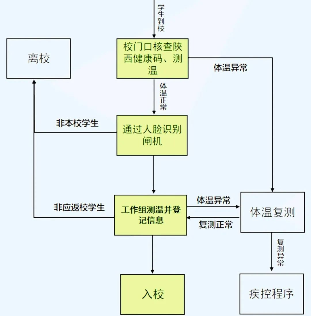 1.返校学生入校时须出示学生证、学生春季开学近14日健康监测表、核酸检测报告(出省返陕者须出示)、健康码绿码,经门禁体温监测正常后方可入校。