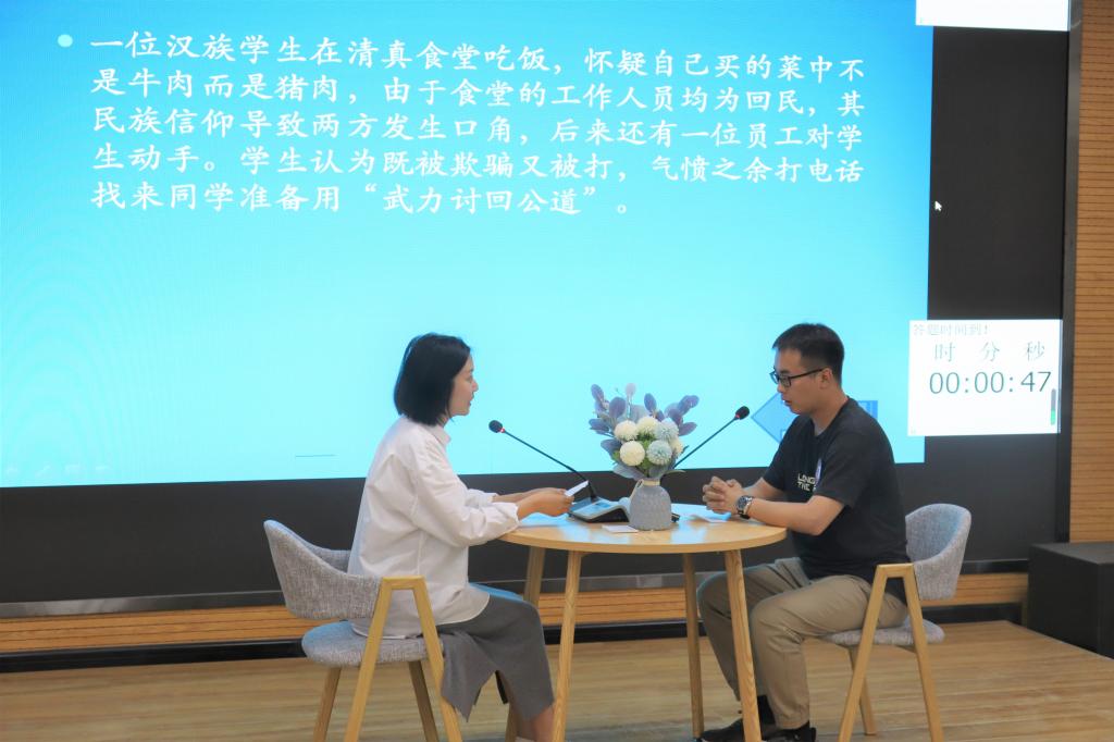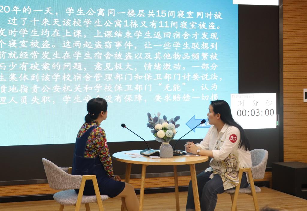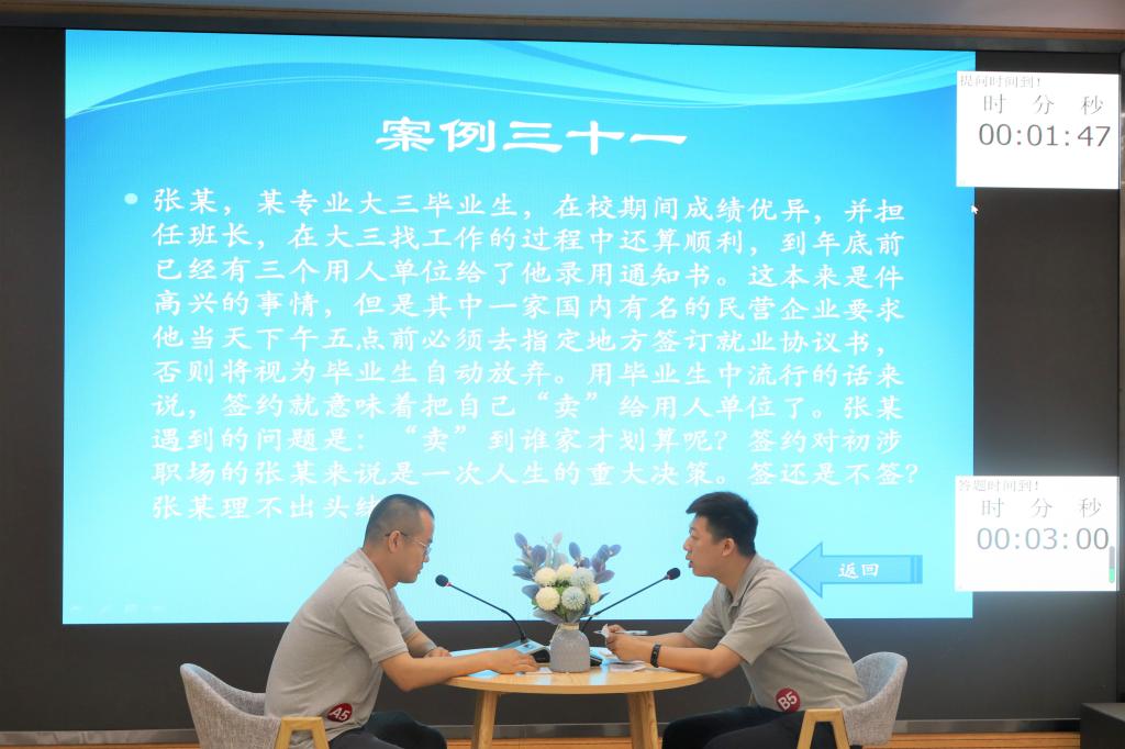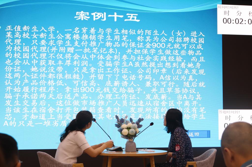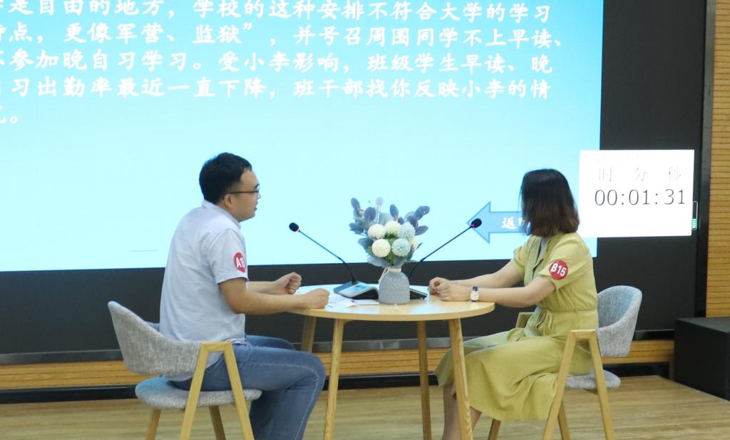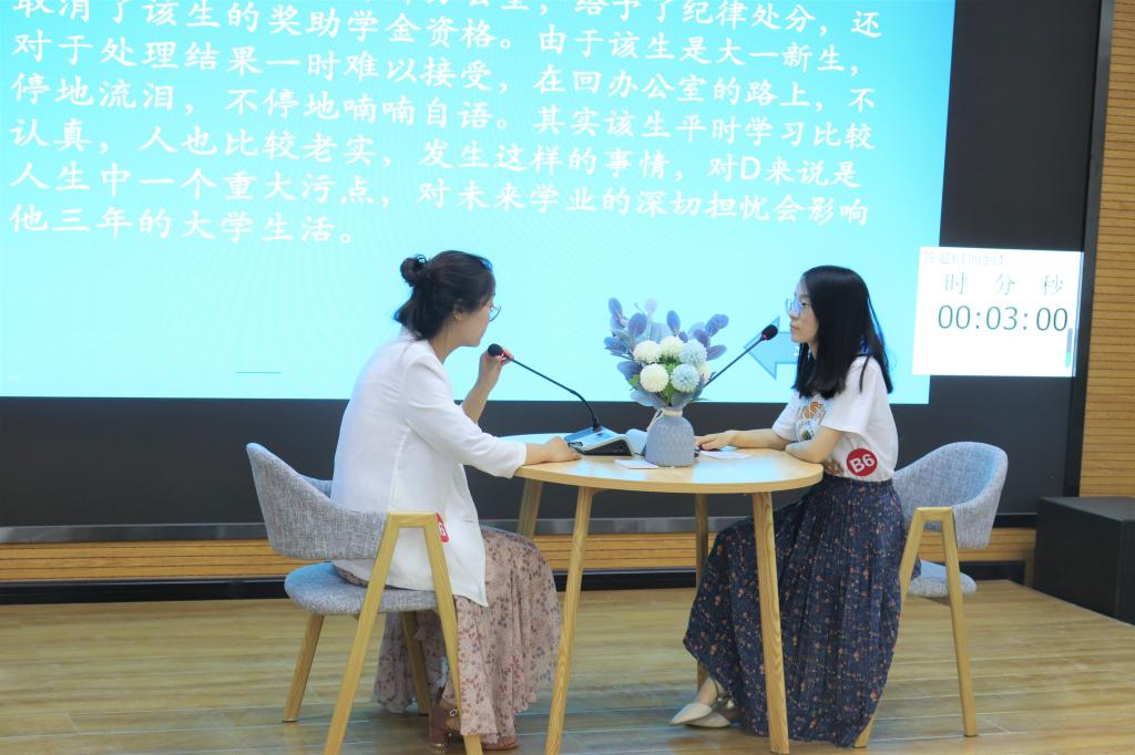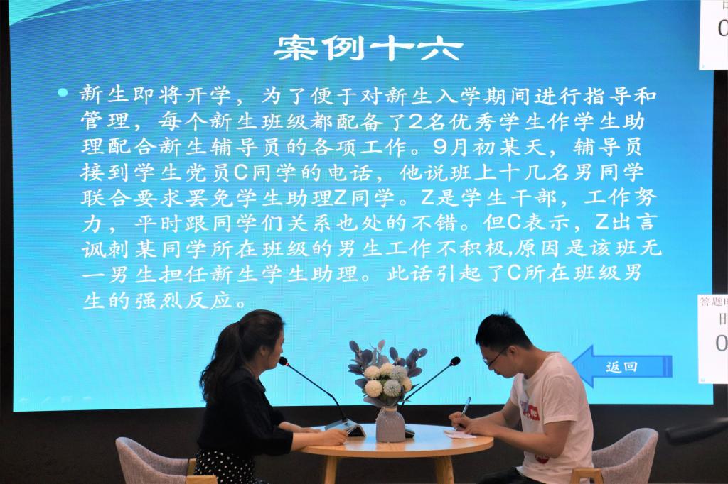 本环节比赛共分18小组,36位辅导员参赛,采用“我提问 你回答”的方式进行,主要考察辅导员面对学生中出现的各类问题,所展现出综合分析问题、研判问题、解决问题的能力。比赛过程中,参赛辅导员都能对案例进行深刻、细致的分析,并提出具体的实施方案,其中一些精彩的问答,让人拍手叫好,赢得了台下观众热烈的掌声。