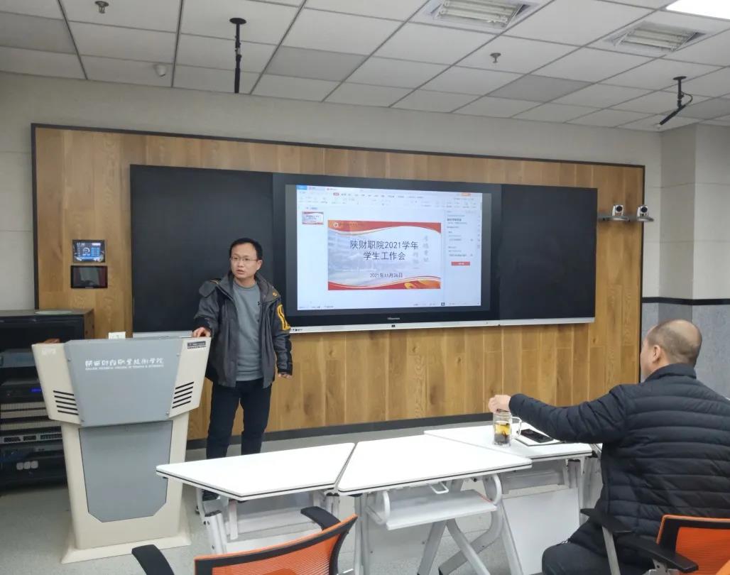 ★2021年11月26日下午,我校在综合楼516智慧教室召开2021学年冬季学生工作例会。学生处处长乔晶策、副处长贺适,各二级学院学生科长、全体辅导员以及学生处全体工作人员参加会议。