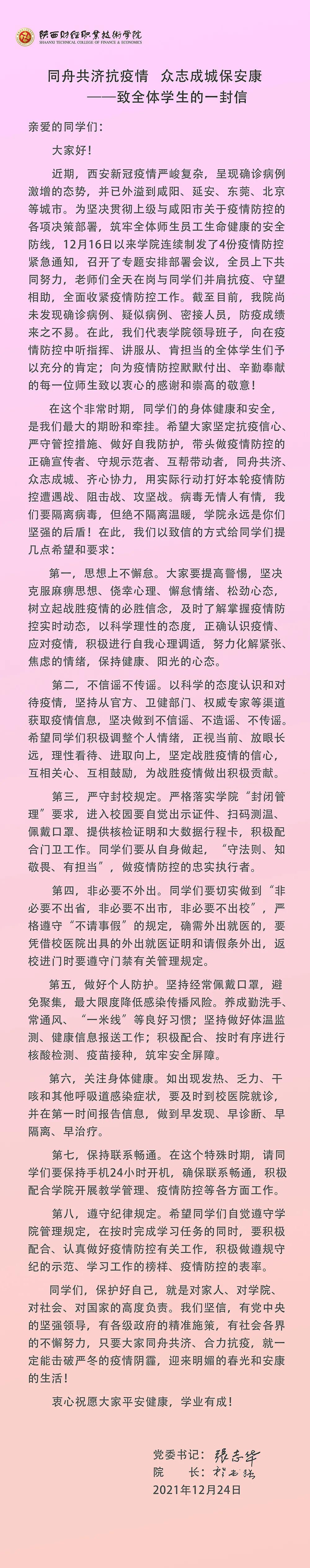 同舟共济抗疫情 众志成城保安康——书记院长致全体学生的一封信