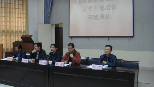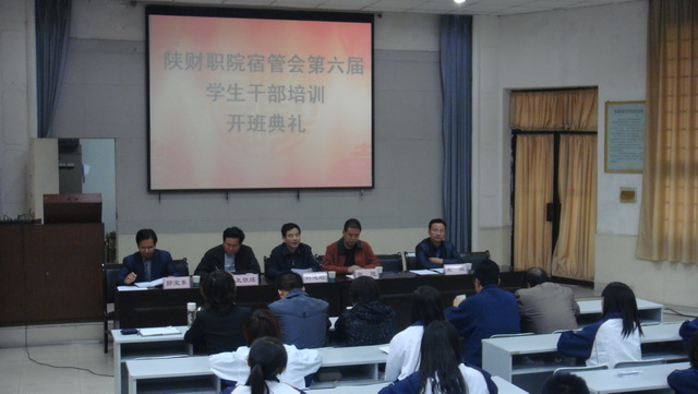 2011年10月24日下午16时20分,陕西财经职业技术学院第六届宿管会学生干部培训班在1号教学楼东阶梯教室拉开帷幕。到会领导及老师有:学院副院长刘建彪老师、学生工作部部长雷旭老师、学生工作部副部长王铁练老师、学生工作部副部长兼院团委书记宋波老师、信息工程系专职副书记兼公寓管理科科长郭宝东老师及公寓管理科全体管理老师。