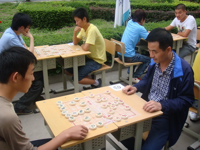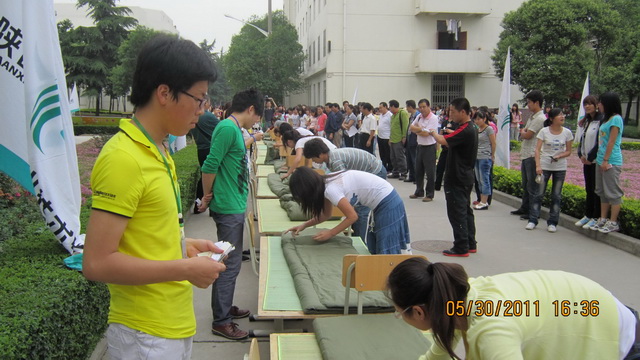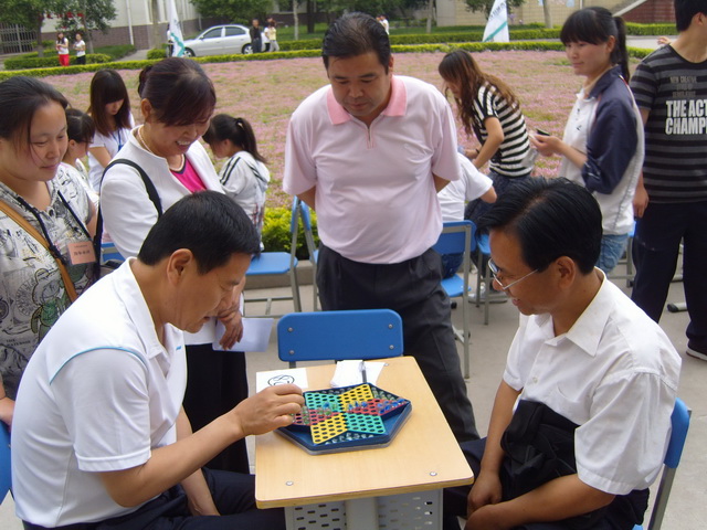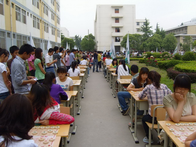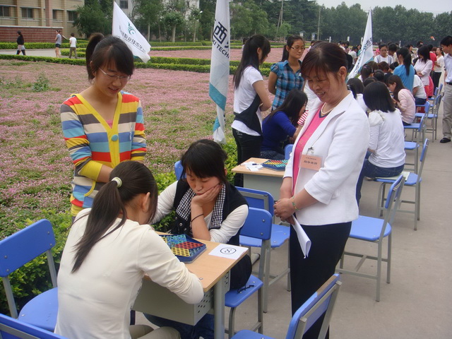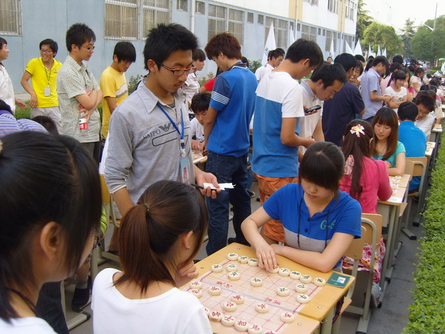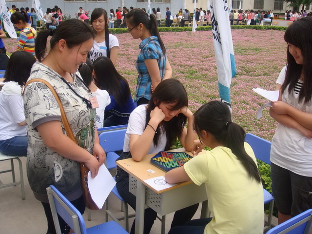 5月30日下午16:40分,新公寓楼前彩旗飘扬,人头攒动,主题宣传板林立。检录处、兑奖处的工作人员忙忙碌禄,裁判员们认真负责,参赛的同学们十分踊跃。棋王争霸(象棋)、跳棋比赛、秀秀你的豆腐块(叠被子比赛)、集字游戏四项活动的现场如火如荼,然而秩序井然。