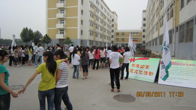 为了庆祝中国共产党建党90周年,丰富同学们的课余文化生活,增强同学们之间的友谊,提高同学们的生活自理能力,锻练提高学生干部的组织、协调和执行能力,我院学生宿舍自治管理委员会于2011年5月30至31日利用两个下午时间,在北院学生新公寓楼前成功举办了学生公寓主题文化活动。活动的主题是“推进公寓文化建设,营造良好生活环境”。活动的口号是“发扬传统文化,共建和谐公寓”。