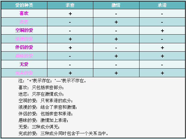 爱情三因素理论认为,两性间的爱情形式,在不同的情侣间的亲密关系和热烈程度各不相同,但在基本上都是这三元素彼此不等量的配合而演化出来。