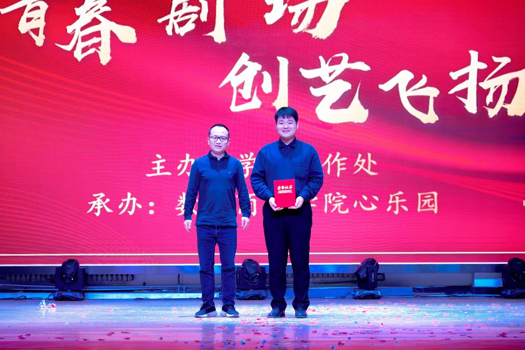 雷旭在致辞中鼓励演员同学把剧目演绎当作镜子,认真审视自己的内心,深入探索自我,挖掘自己尚未发现的潜力与情感;希望观赛同学沉浸式体验剧情,与剧中角色产生情感共鸣,从中获得慰藉与鼓舞,共同营造一个充满爱与关怀的校园氛围。