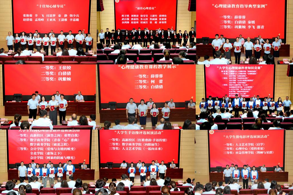 雷旭为“先进二级辅导站”和“最美育心师”获奖集体及个人颁奖;乔晶策为“十佳知心辅导员”颁奖;各二级学院书记依次为“最佳心理委员”、心理健康教育指导典型案例、典型经验、课程教学展示、心理科普知识竞赛、心理情景剧、手语操、微电影评选等专项活动的获奖师生代表颁奖。