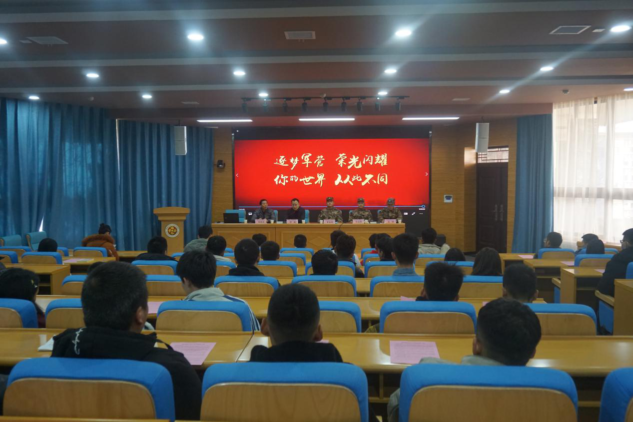 为贯彻落实省上征兵工作会议精神,切实做好我院2021年大学生应征入伍工作,12月24日下午,我院在继续教育培训中心举办2020年大学生征兵工作宣讲会。秦都区人武部部长黄金刚、秦都区人武部副部长华永伟、秦都区人武部军事科参谋王渊应邀宣讲,征兵工作负责人侯晓军和近百名学生代表参加会议。会议由学生工作处副处长贺适主持。
