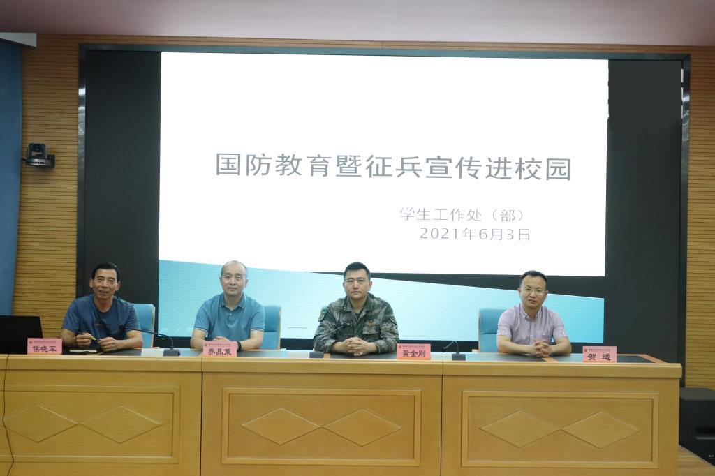 16:30,活动的第二部分——国防教育讲座在在学院继续教育中心培训厅举行,学生工作处处长乔晶策、副处长贺适、秦都区武装部部长黄金刚、我院征兵工作站侯晓军、各二级学院学生管理科科长、负责征兵工作的辅导员以及有意向报名应征入伍的学生代表百余人参加了本次活动。乔晶策致辞对秦都区武装部黄金刚一行表示欢迎,并对秦都区武装部一直以来对我院征兵工作的大力支持表示感谢,他指出,征兵工作是建设巩固国防和强大军队的源头工程、造血工程、希望工程,是军队现代化建设的基础性工程。我院紧紧围绕确保兵员质量这个核心,把征兵工作与大学生国防教育紧密结合,按照征兵要求,完善制度机制,把征兵政策宣传好,把后续工作保障好,力争多选拔优秀大学生入伍,从源头多输送高质量兵员。他希望同学们响应召唤,携笔从戎,青春逐梦,书写华章。为国防现代建设做出积极贡献。