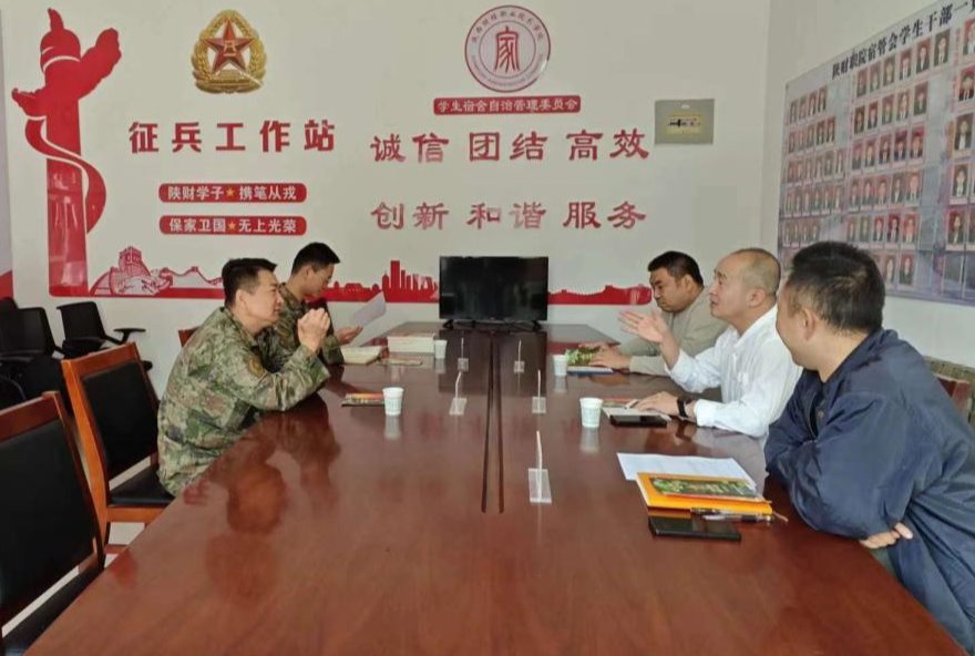近日,咸阳市秦都区人民武装部部长李耀斌、军事科参谋汪鹏一行来我校调研2024级新生军训及大学生征兵入伍工作。校学生工作处处长乔晶策、副处长袁永彦,征兵工作站王乐参加了调研座谈会。