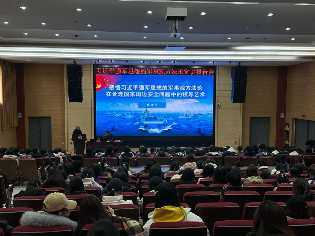 会上,焦维东政委以《感悟习近平强军思想的军事观方法论在处理国家周边安全问题中的领导艺术》为题,为师生们解读习近平强军思想,从党中央对当前国家安全形势的总体研判,当前国际安全形势与我国安全形势特点,深刻体会党中央习主席对周边安全问题处理的高超领导艺术,我们普通人的责任与担当等四个方面阐述了深入学习贯彻习近平强军思想的重要性和必要性。焦维东的授课主题鲜明、内容丰富,融合视频、图例与实证,视野宏大、史料详实,兼具时代感、针对性与实效性,展现出强大的感染力、穿透力与思想力,具有很强的针对性和指导意义,进一步增强了师生们的国防意识和家国情怀,激发了每个有志青年携笔从戎,保家卫国的参军热情。