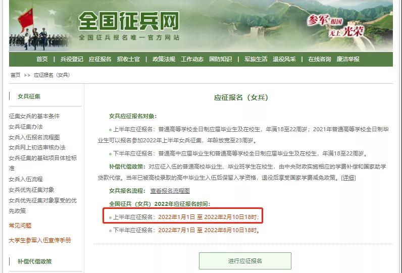 报名对象:普通高等学校全日制应届毕业生及在校生,年满18至22周岁;2021年普通高等学校全日制毕业生可以报名参加2022年上半年女兵征集,年龄放宽至23周岁。