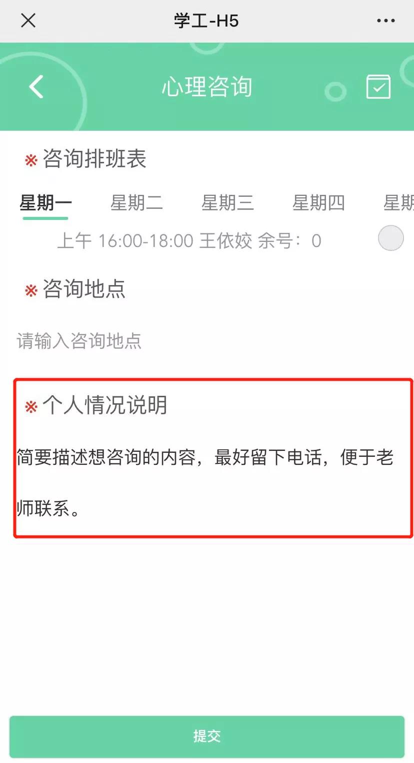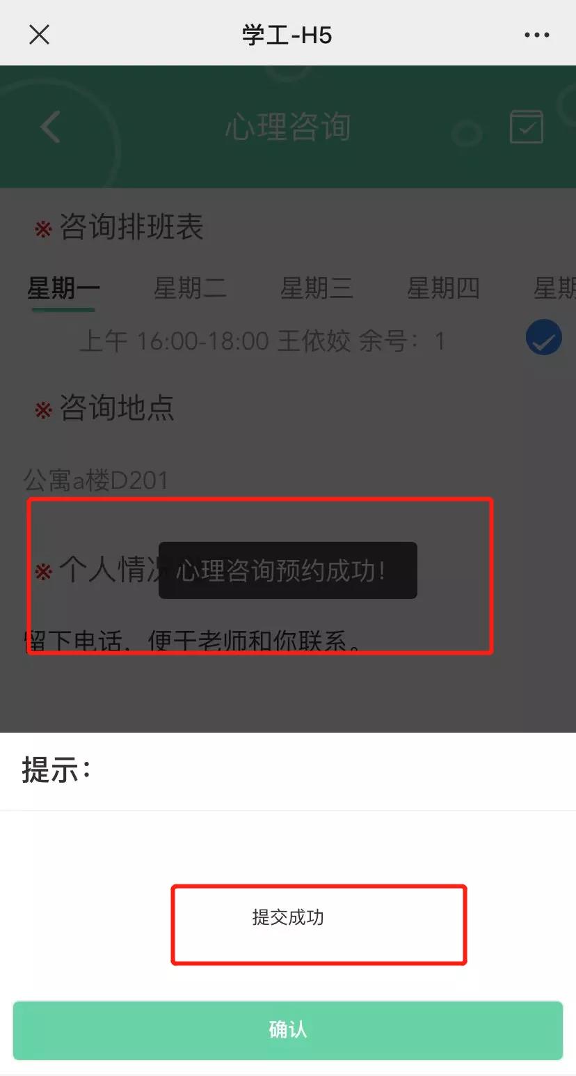 1.关注学生处微信公众号,点击右下角学生服务,再点击学工系统,进入后点击心理健康,选择心理咨询,即可预约,时间不限,全天24小时均可。
